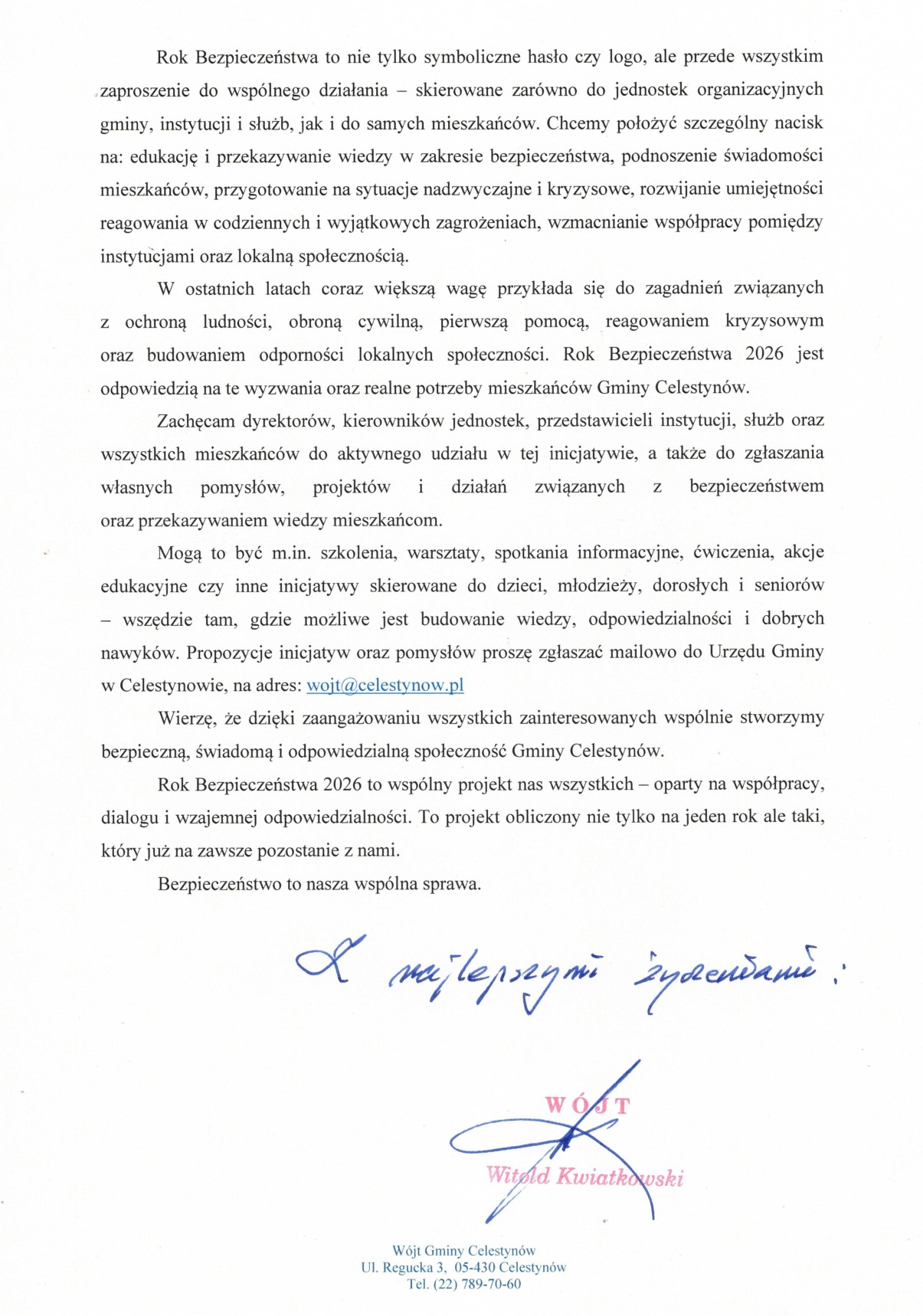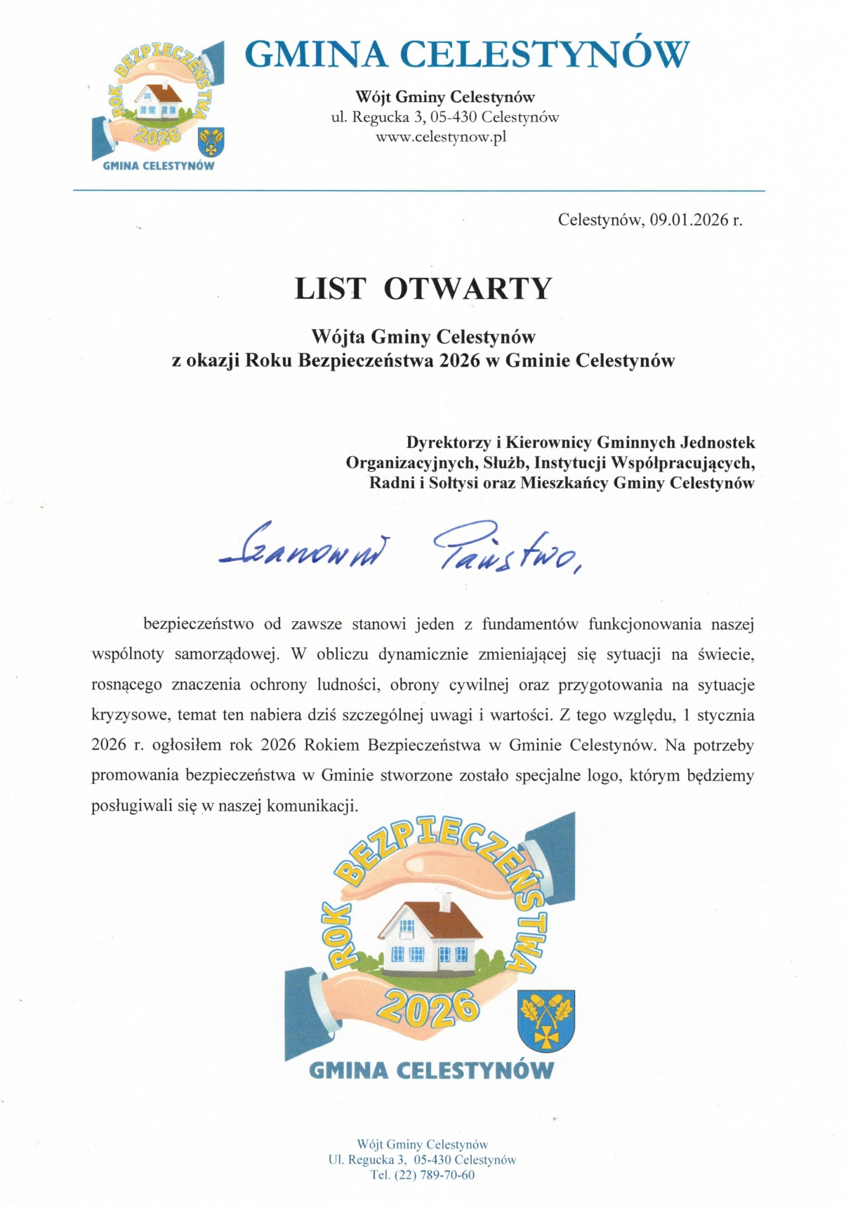 List Otwarty Wójta Gminy Celestynów z okazji Roku Bezpieczeństwa 2026 w Gminie Celestynów