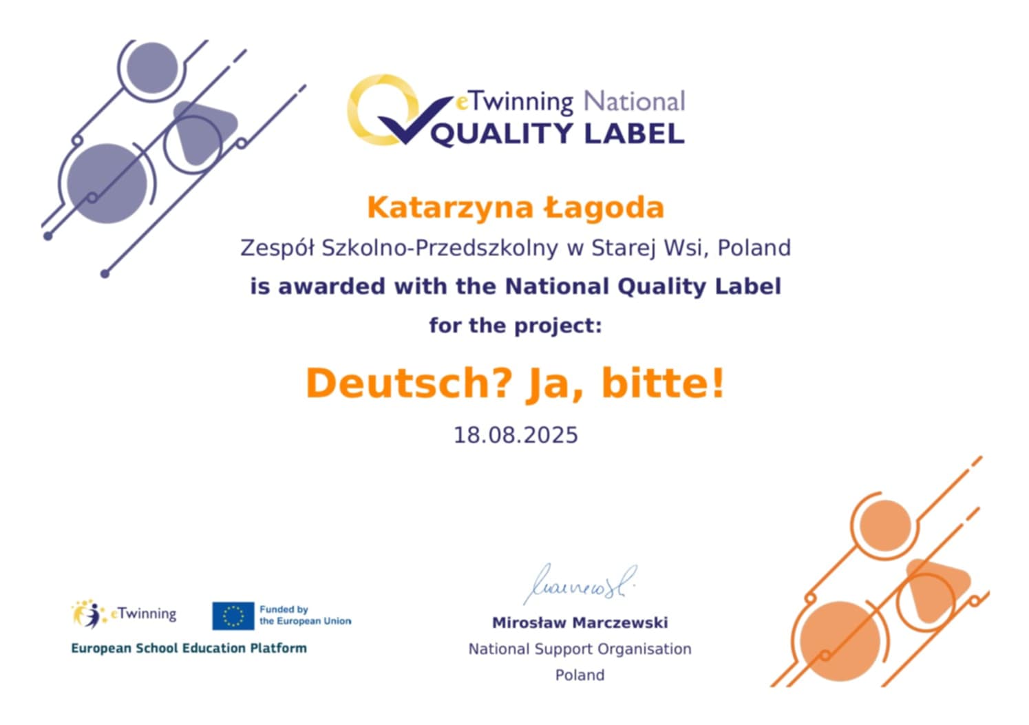 W roku szkolnym 2024/2025 uczniowie klas 7a i 7b realizowali projekt eTwinning „Deutsch? Ja, bitte!”, którego głównym celem było rozwijanie umiejętności językowych i wzbudzanie motywacji do nauki języka niemieckiego. Podczas współpracy z rówieśnikami z innych krajów młodzież brała udział w grach językowych, tworzyła prezentacje multimedialne, wymieniała się materiałami kulturowymi i wspólnie opracowywała zadania online. Dzięki kreatywności, zaangażowaniu i różnorodnym działaniom projekt został wyróżniony prestiżową Krajową Odznaką Jakości eTwinning, która potwierdza jego wysoką wartość edukacyjną i innowacyjność. Celem przyznawania Krajowej Odznaki Jakości jest wyróżnienie nauczycieli i szkół, których działania w ramach eTwinningu reprezentują wysoki poziom. Dla nauczycieli jest to uznanie ich pracy, dla uczniów to większa motywacja do prowadzenia zaplanowanych działań, a dla szkoły – publiczne potwierdzenie zaangażowania i dążenia do jakości oraz otwartość na współpracę europejską. Sukces projektu motywuje nas do dalszej współpracy – już planujemy kolejne działania w programie eTwinning, aby rozwijać nasze umiejętności i nawiązywać nowe międzynarodowe kontakty.