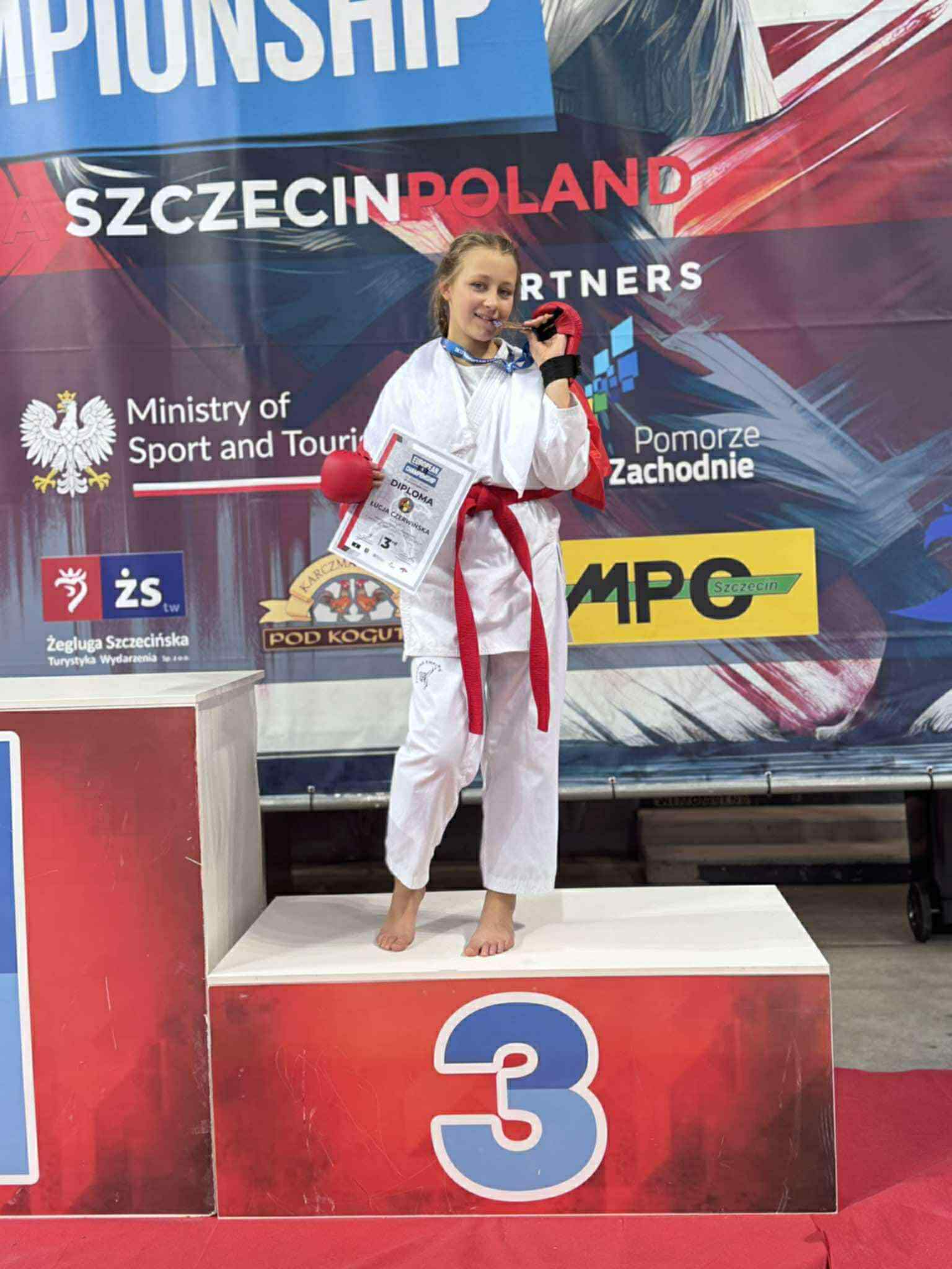 Z wielką radością i dumą informujemy o wyjątkowym sukcesie sportowym Łucji Czerwińskiej, uczennicy klasy 7a, która reprezentując Polskę w składzie kadry narodowej, osiągnęła znakomite wyniki podczas Mistrzostw Europy Karate IKU. Zawody odbyły się w Szczecinie w dniach 23–26 października 2025 roku, gromadząc niemal 800 zawodników z 20 krajów.