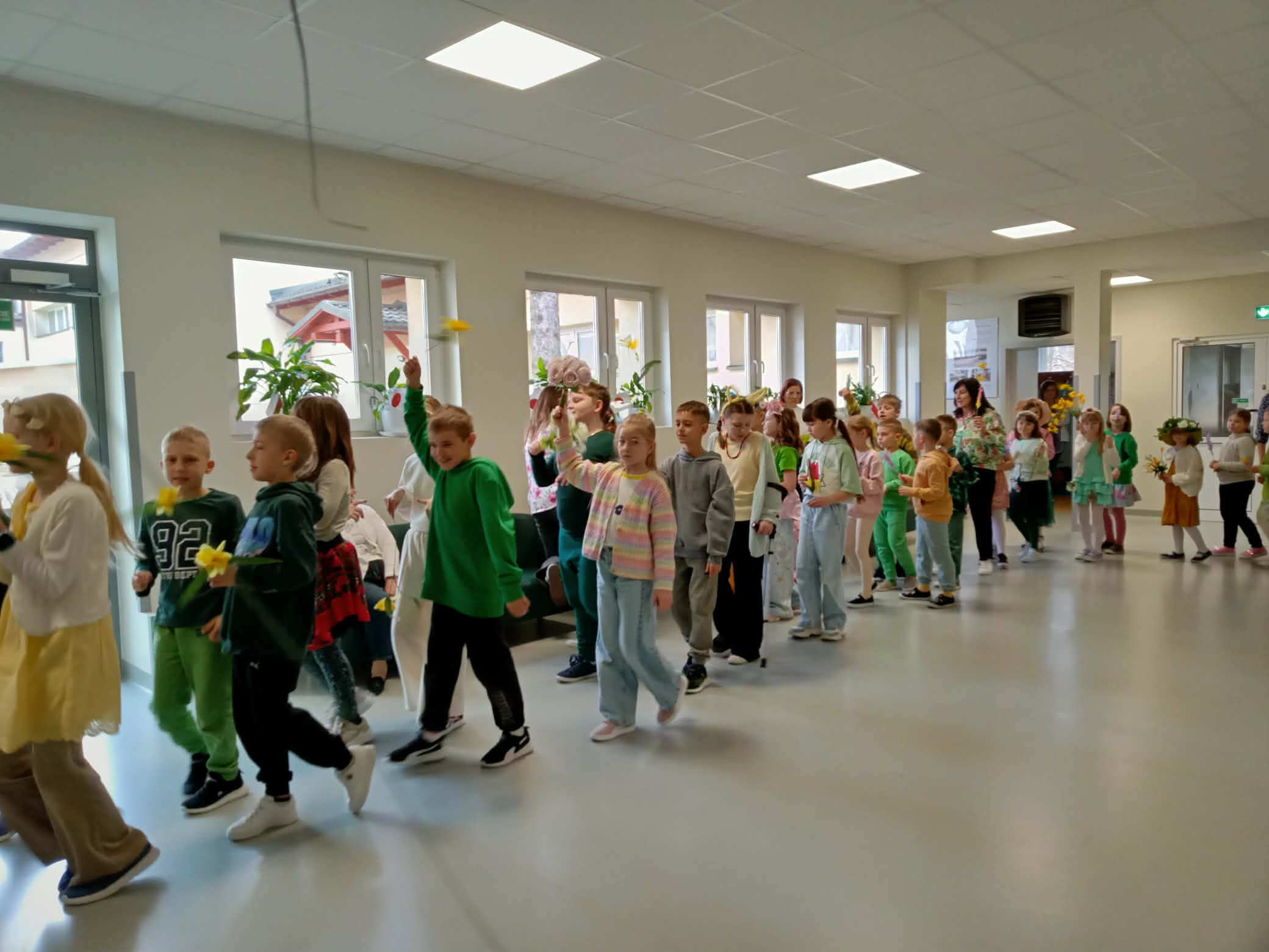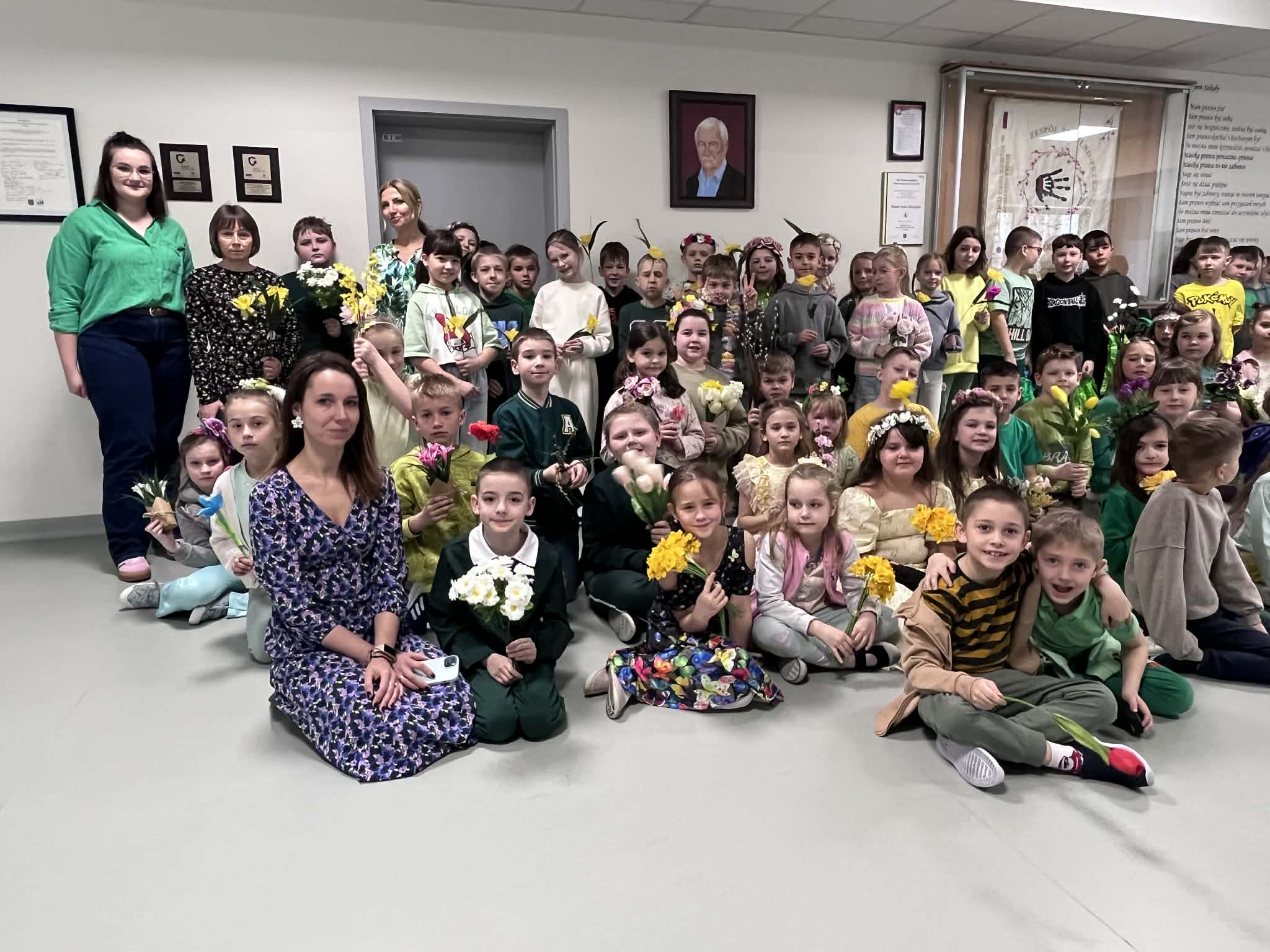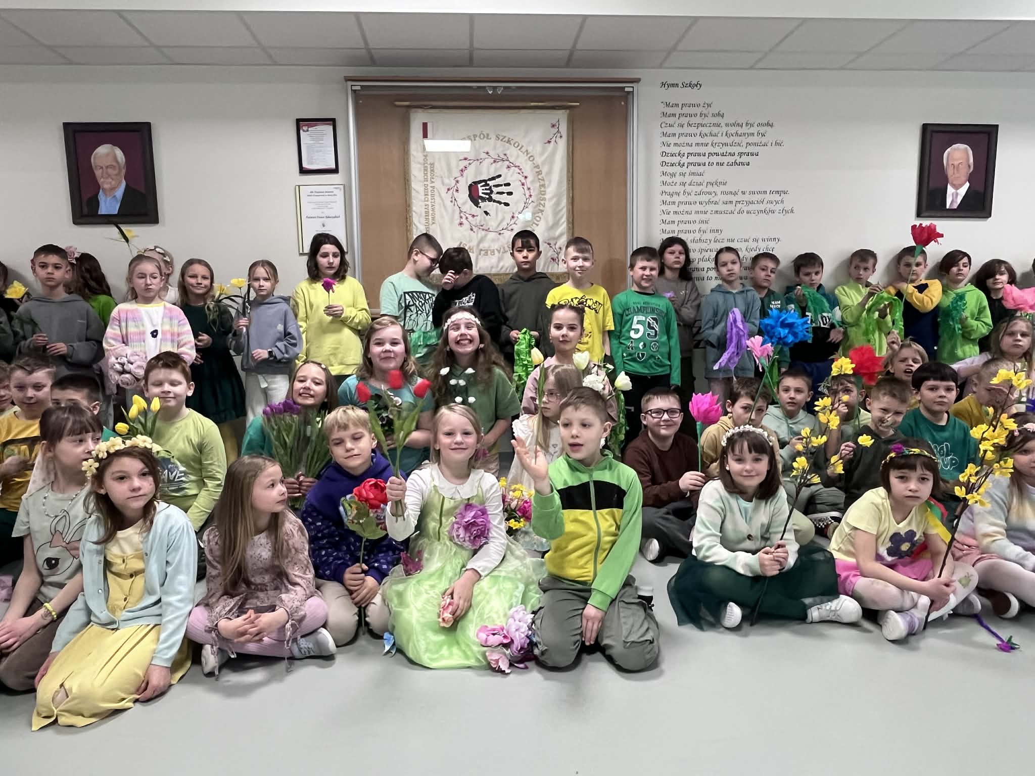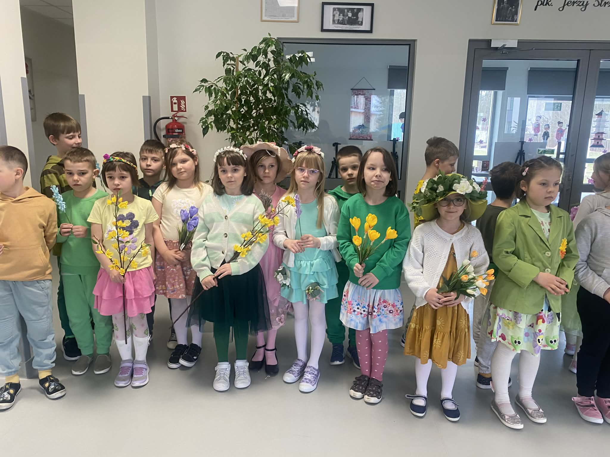 Pierwszy dzień wiosny w naszej Szkole upłynął w wyjątkowo radosnej i kolorowej atmosferze. Uczniowie klas 1–8 wraz z nauczycielami aktywnie włączyli się w świętowanie, ubierając się w barwy kojarzące się z budzącą się do życia przyrodą – dominowały odcienie żółci i zieleni. Korytarze oraz sale lekcyjne wypełniły się wiosennym klimatem, a uczniowie stworzyli niezwykłą „żywą łąkę”. Stroje zostały wzbogacone o elementy kwiatowe – pojawiły się opaski, wianki, kapelusze oraz dekoracje we włosach i na ubraniach. Pomysłowość i zaangażowanie uczniów wprowadziły wszystkich w radosny, serdeczny i pełen życzliwości nastój, który chcielibyśmy, aby pozostał z nami na długo.