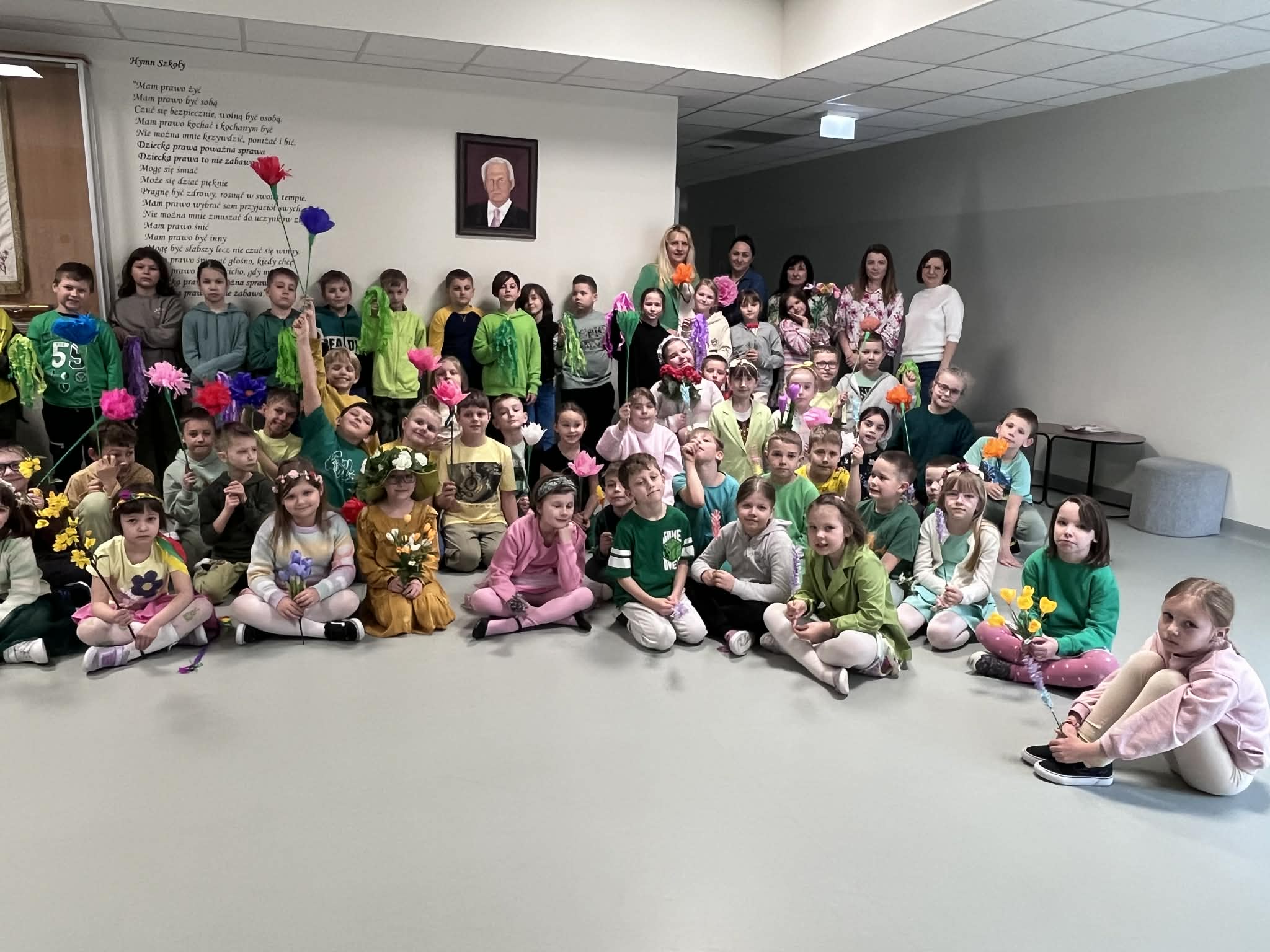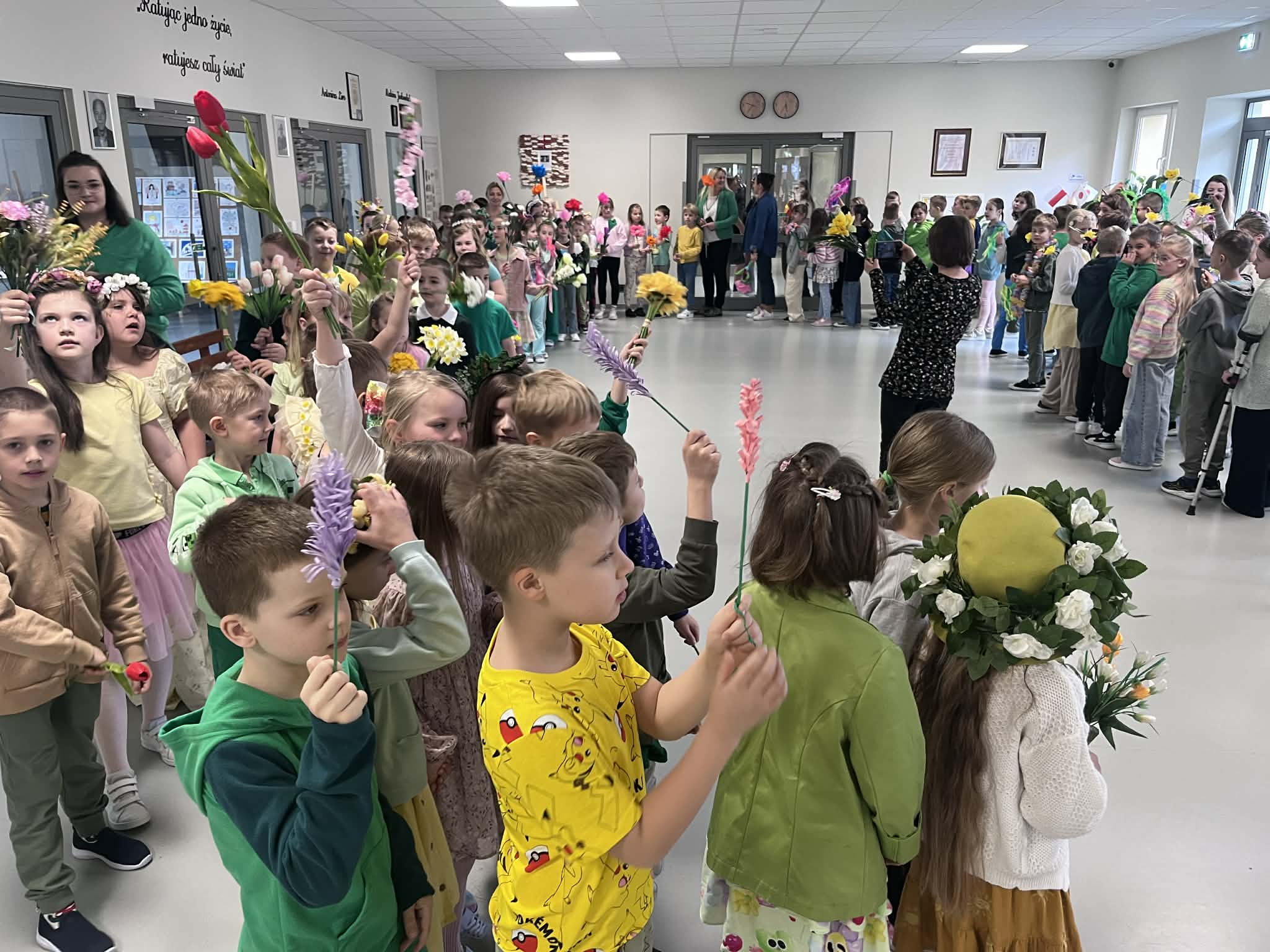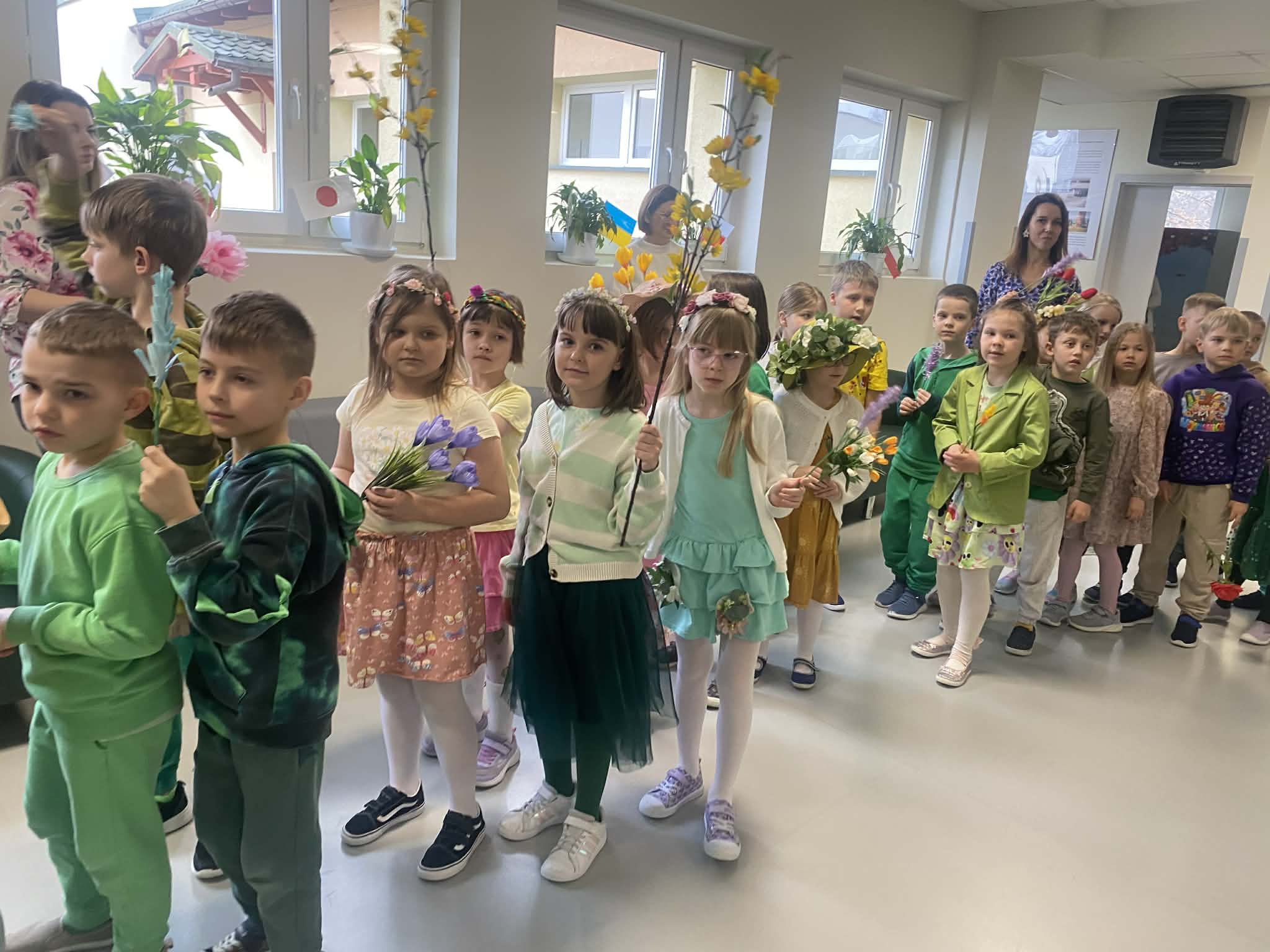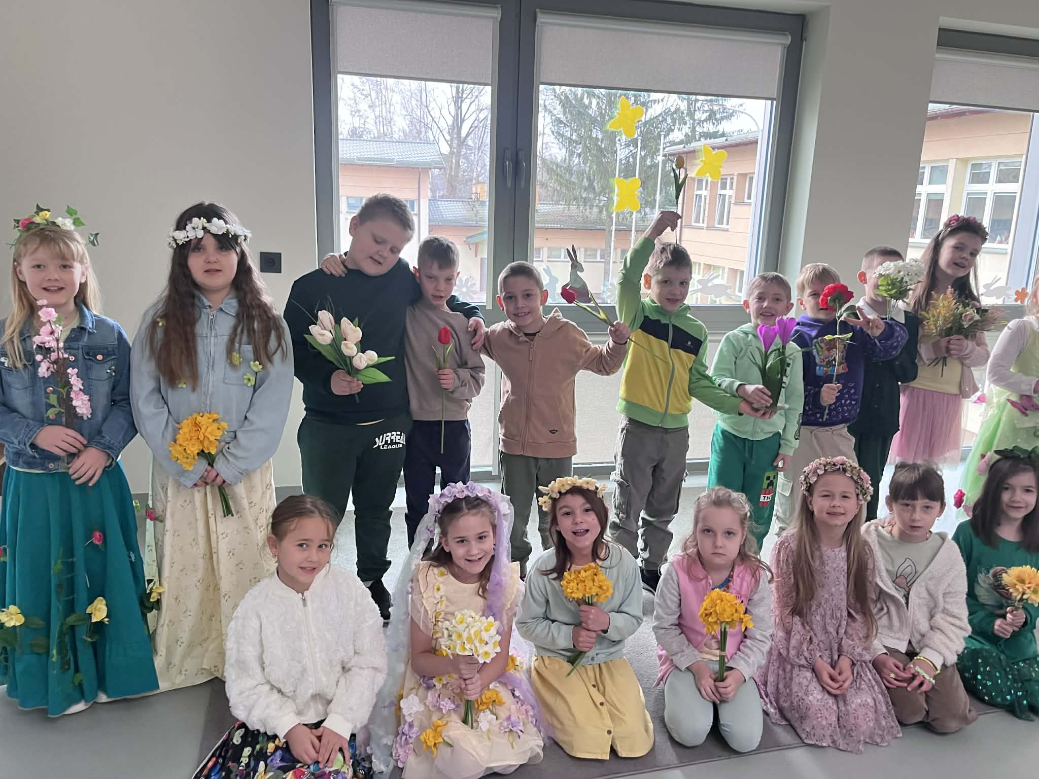 Pierwszy dzień wiosny w naszej Szkole upłynął w wyjątkowo radosnej i kolorowej atmosferze. Uczniowie klas 1–8 wraz z nauczycielami aktywnie włączyli się w świętowanie, ubierając się w barwy kojarzące się z budzącą się do życia przyrodą – dominowały odcienie żółci i zieleni. Korytarze oraz sale lekcyjne wypełniły się wiosennym klimatem, a uczniowie stworzyli niezwykłą „żywą łąkę”. Stroje zostały wzbogacone o elementy kwiatowe – pojawiły się opaski, wianki, kapelusze oraz dekoracje we włosach i na ubraniach. Pomysłowość i zaangażowanie uczniów wprowadziły wszystkich w radosny, serdeczny i pełen życzliwości nastój, który chcielibyśmy, aby pozostał z nami na długo.