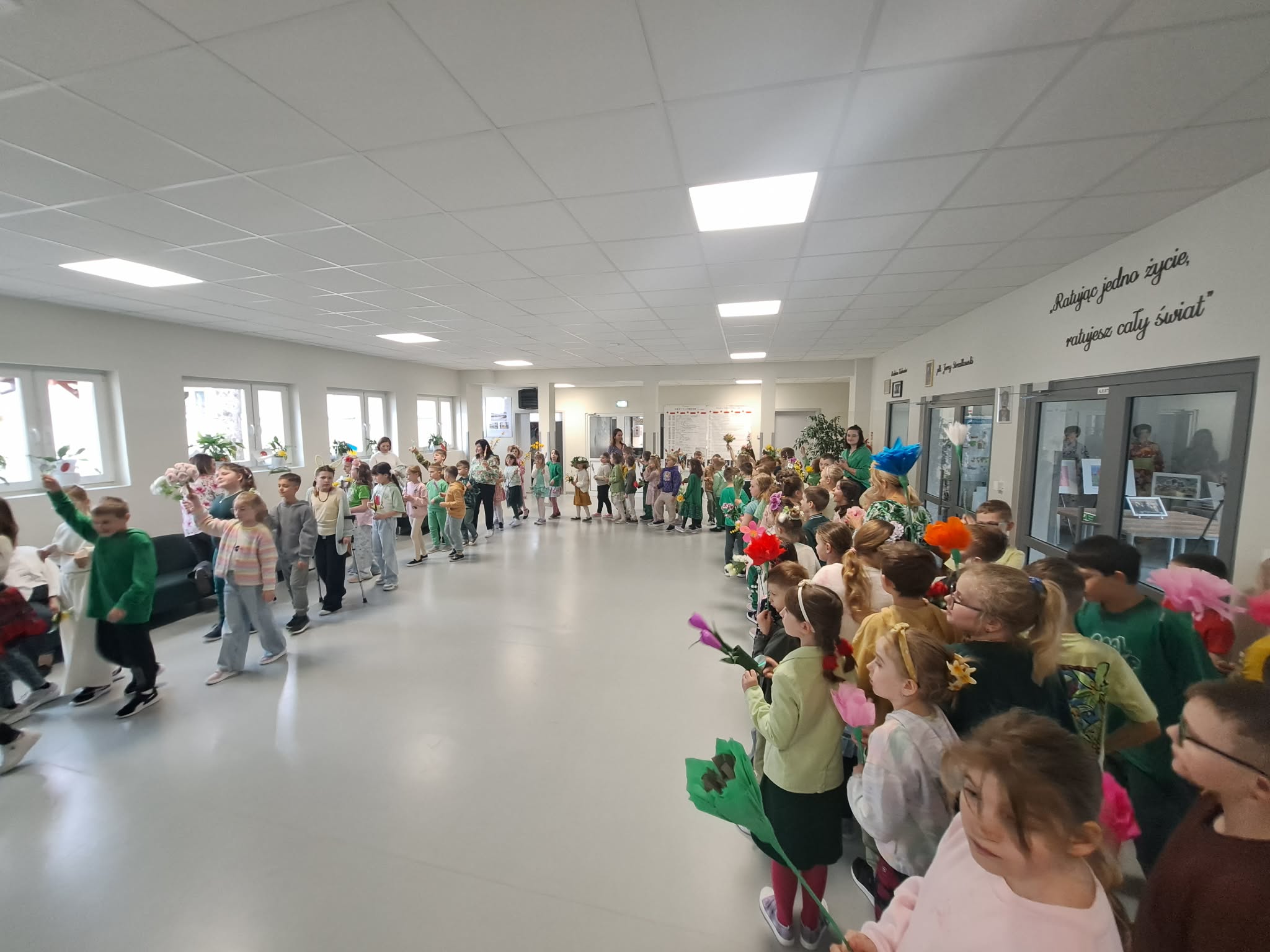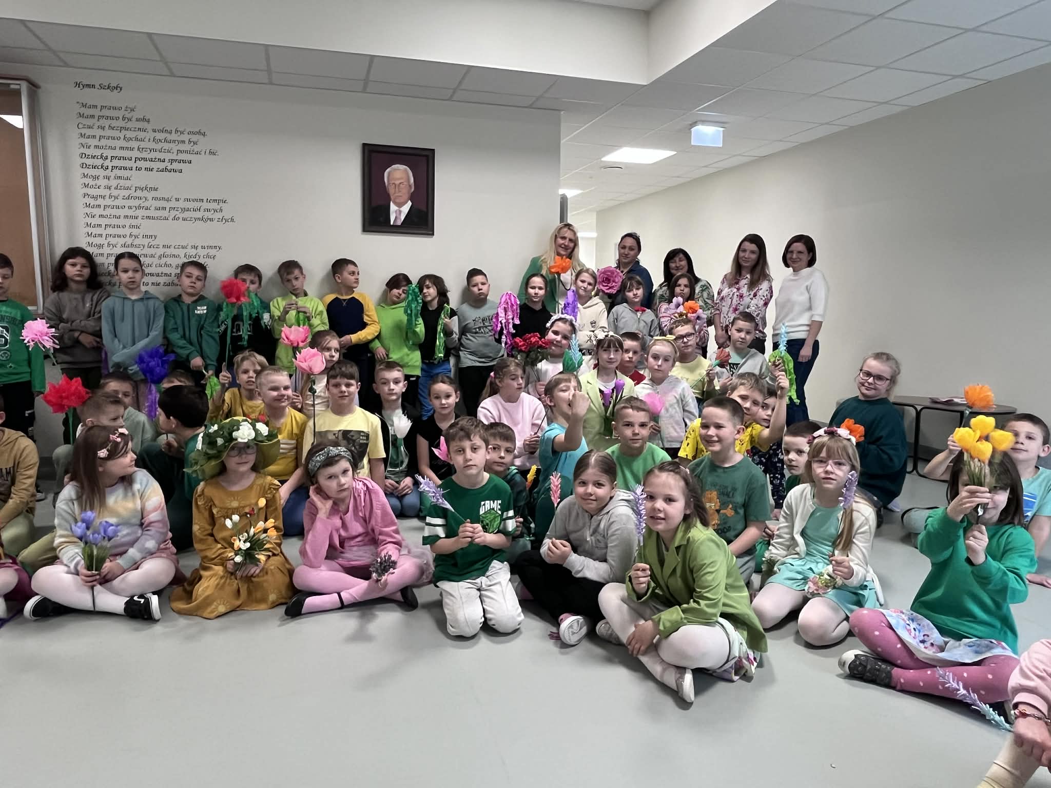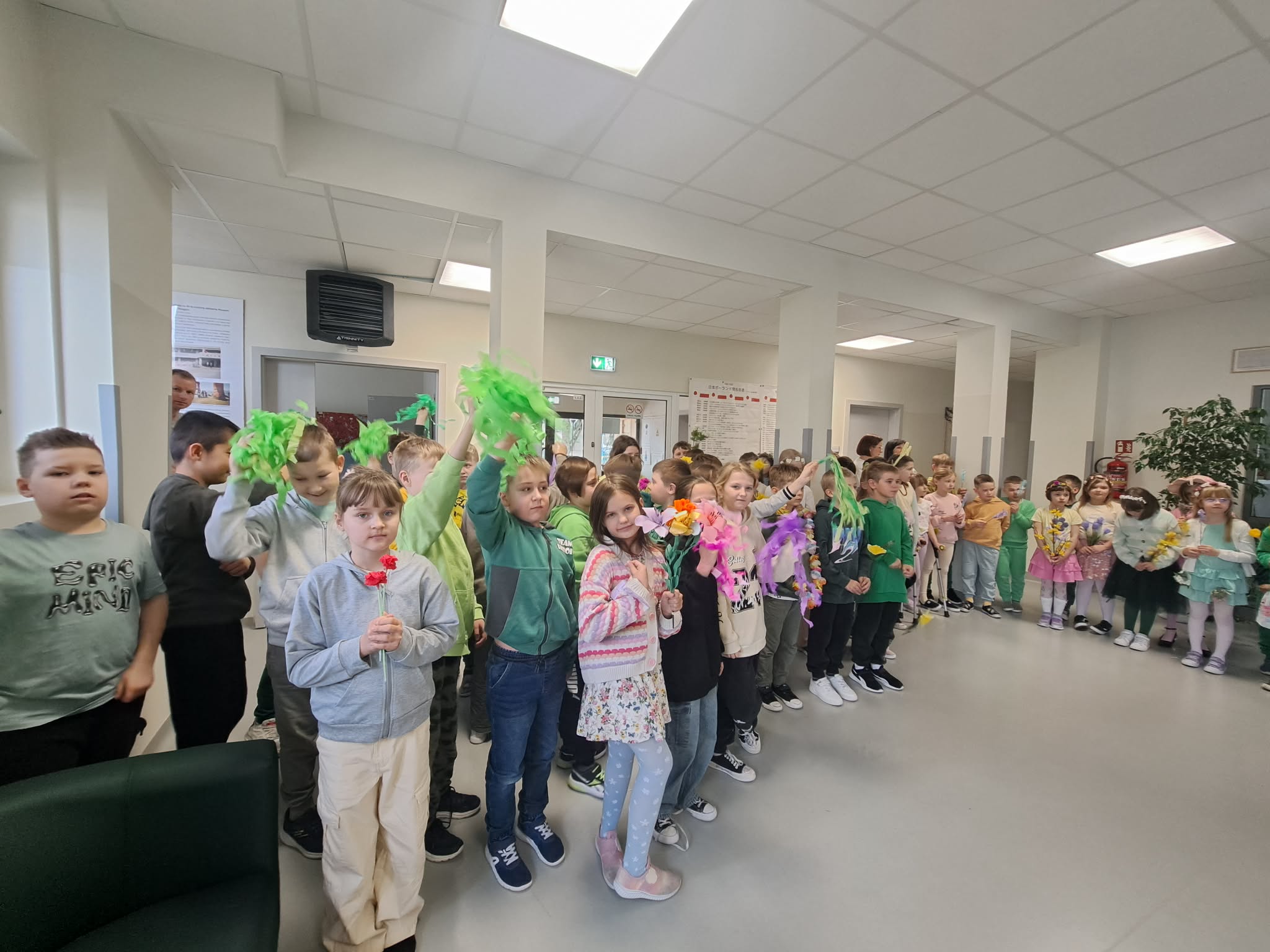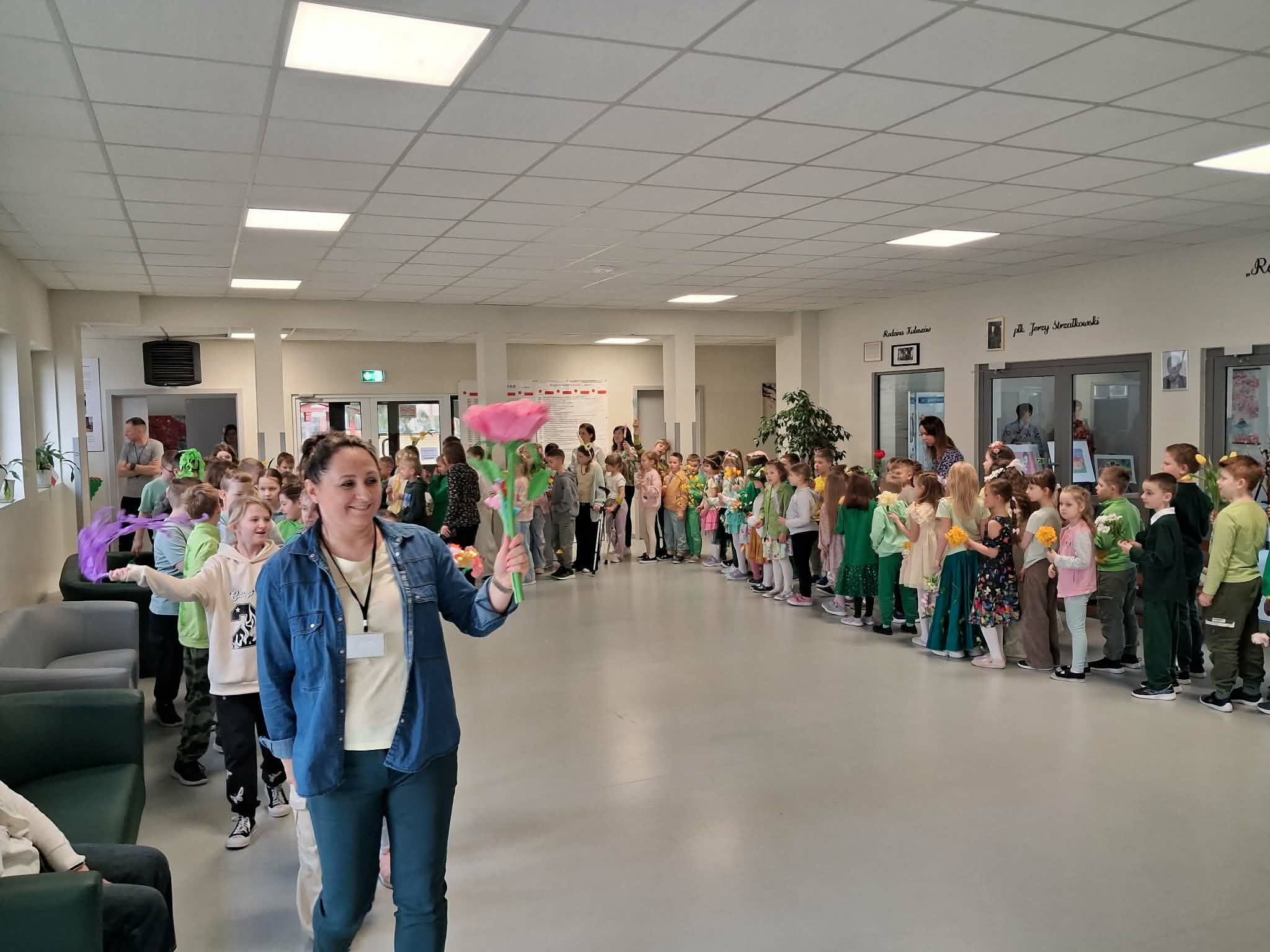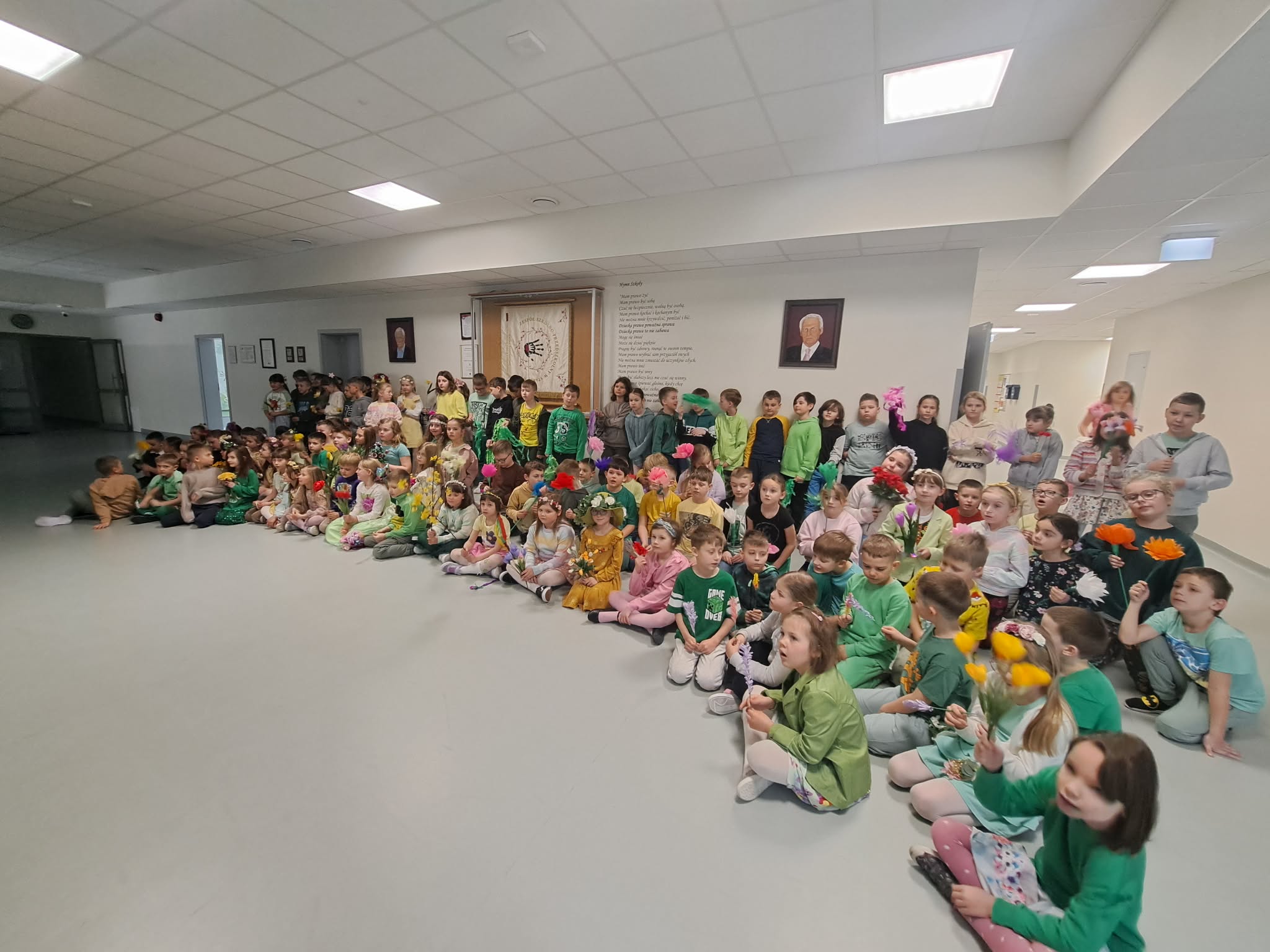 Pierwszy dzień wiosny w naszej Szkole upłynął w wyjątkowo radosnej i kolorowej atmosferze. Uczniowie klas 1–8 wraz z nauczycielami aktywnie włączyli się w świętowanie, ubierając się w barwy kojarzące się z budzącą się do życia przyrodą – dominowały odcienie żółci i zieleni. Korytarze oraz sale lekcyjne wypełniły się wiosennym klimatem, a uczniowie stworzyli niezwykłą „żywą łąkę”. Stroje zostały wzbogacone o elementy kwiatowe – pojawiły się opaski, wianki, kapelusze oraz dekoracje we włosach i na ubraniach. Pomysłowość i zaangażowanie uczniów wprowadziły wszystkich w radosny, serdeczny i pełen życzliwości nastój, który chcielibyśmy, aby pozostał z nami na długo.