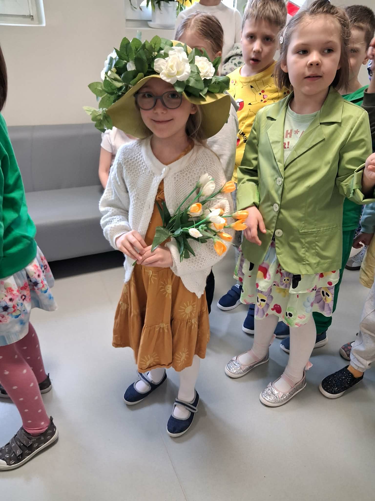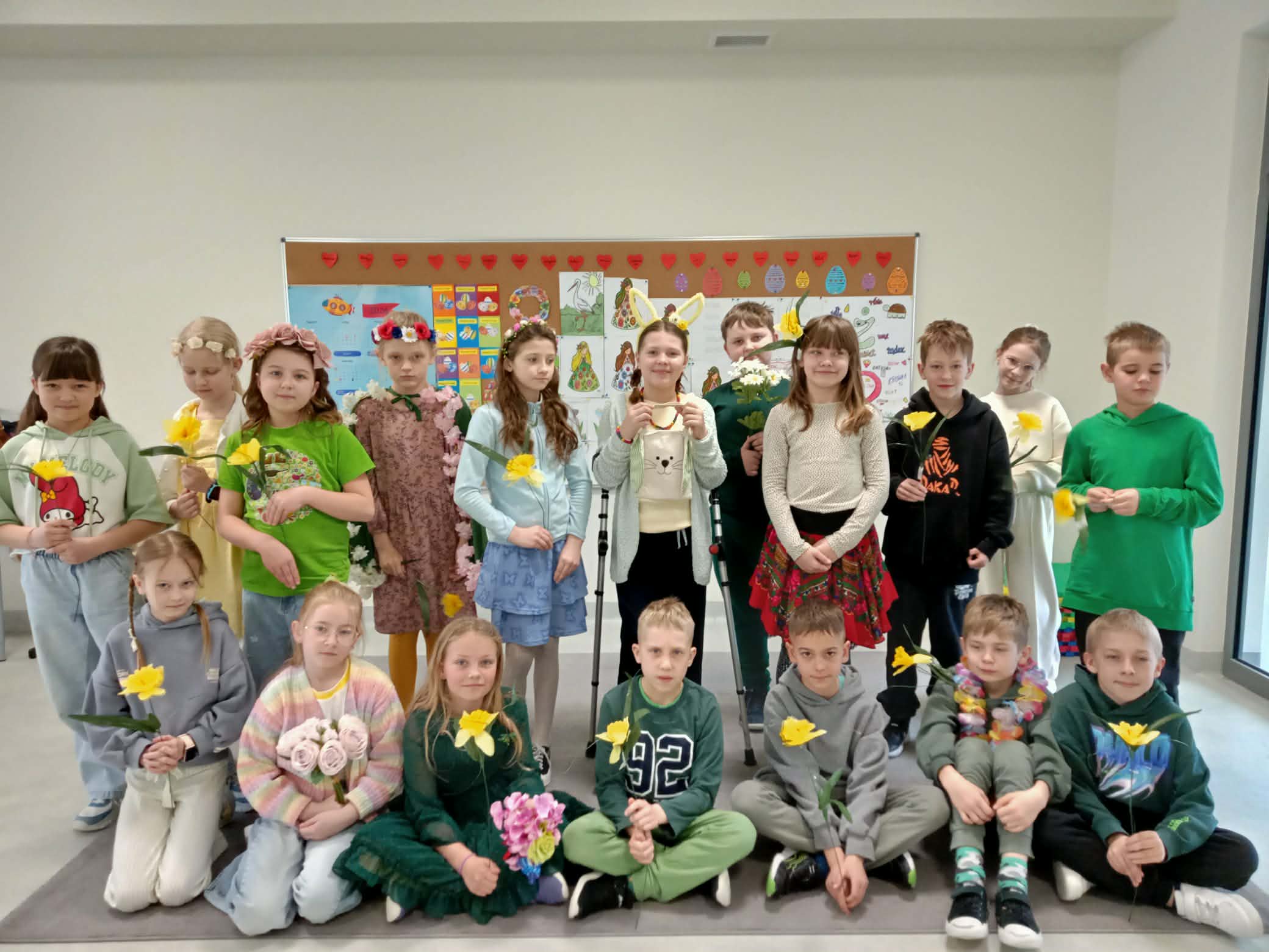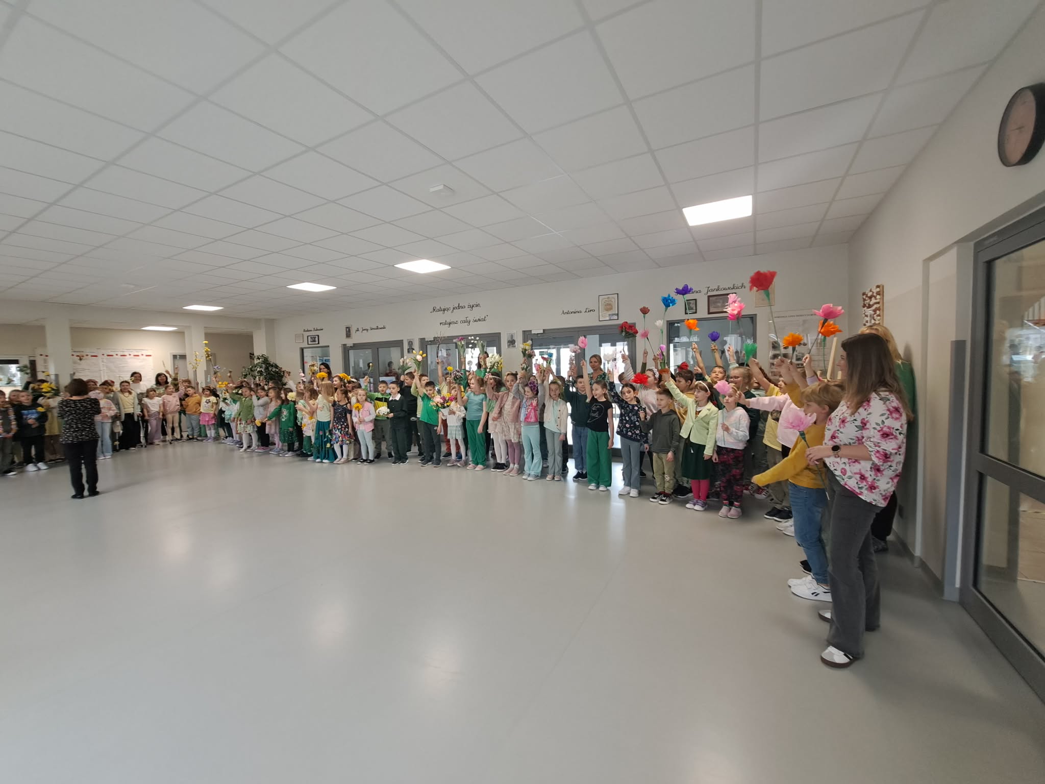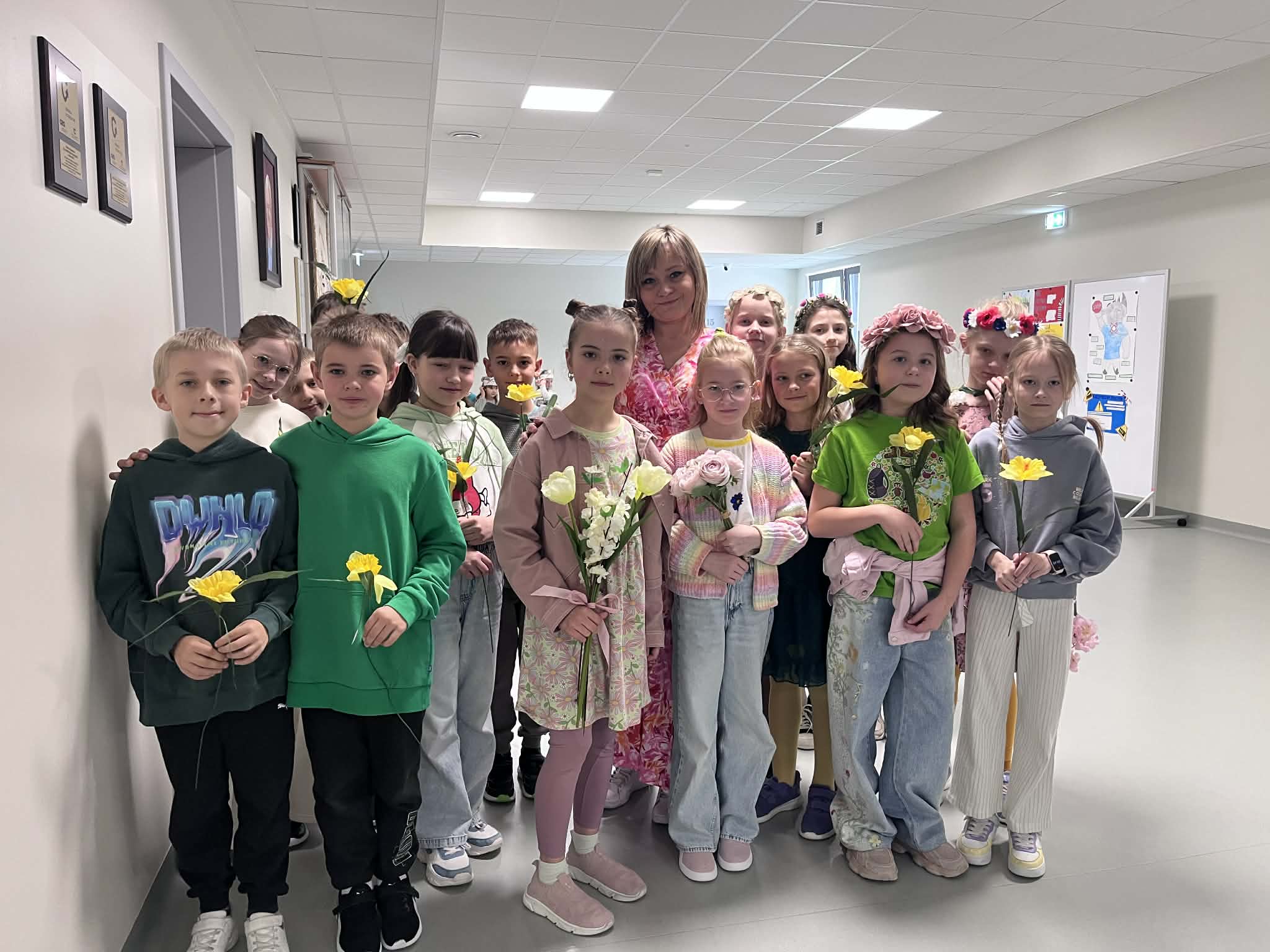 Pierwszy dzień wiosny w naszej Szkole upłynął w wyjątkowo radosnej i kolorowej atmosferze. Uczniowie klas 1–8 wraz z nauczycielami aktywnie włączyli się w świętowanie, ubierając się w barwy kojarzące się z budzącą się do życia przyrodą – dominowały odcienie żółci i zieleni. Korytarze oraz sale lekcyjne wypełniły się wiosennym klimatem, a uczniowie stworzyli niezwykłą „żywą łąkę”. Stroje zostały wzbogacone o elementy kwiatowe – pojawiły się opaski, wianki, kapelusze oraz dekoracje we włosach i na ubraniach. Pomysłowość i zaangażowanie uczniów wprowadziły wszystkich w radosny, serdeczny i pełen życzliwości nastój, który chcielibyśmy, aby pozostał z nami na długo.